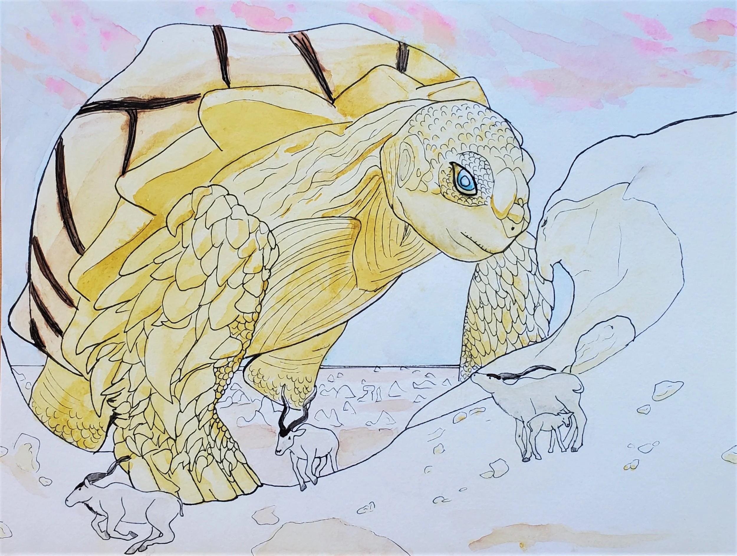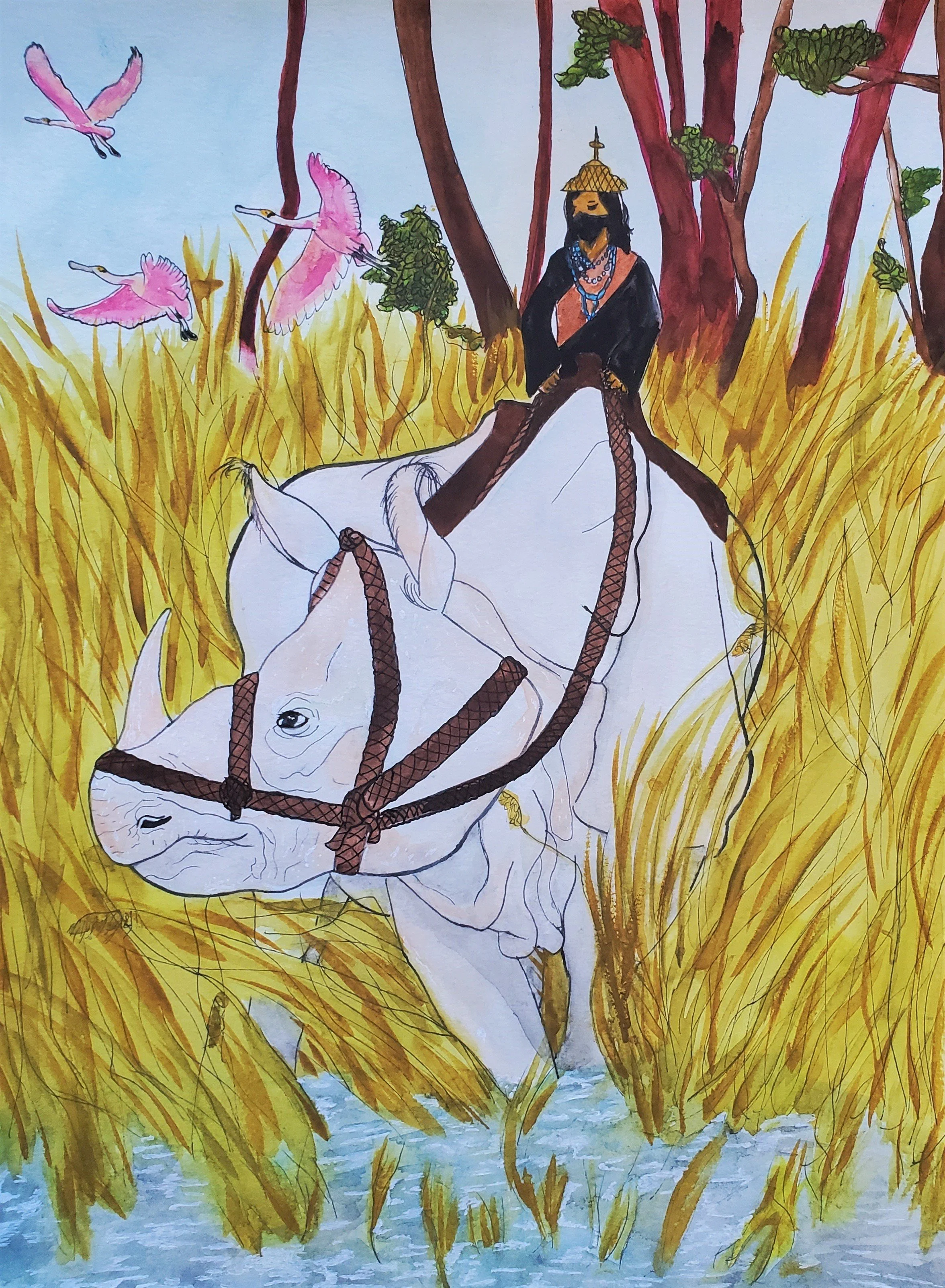 Ink, paint markers, and watercolour on paper
